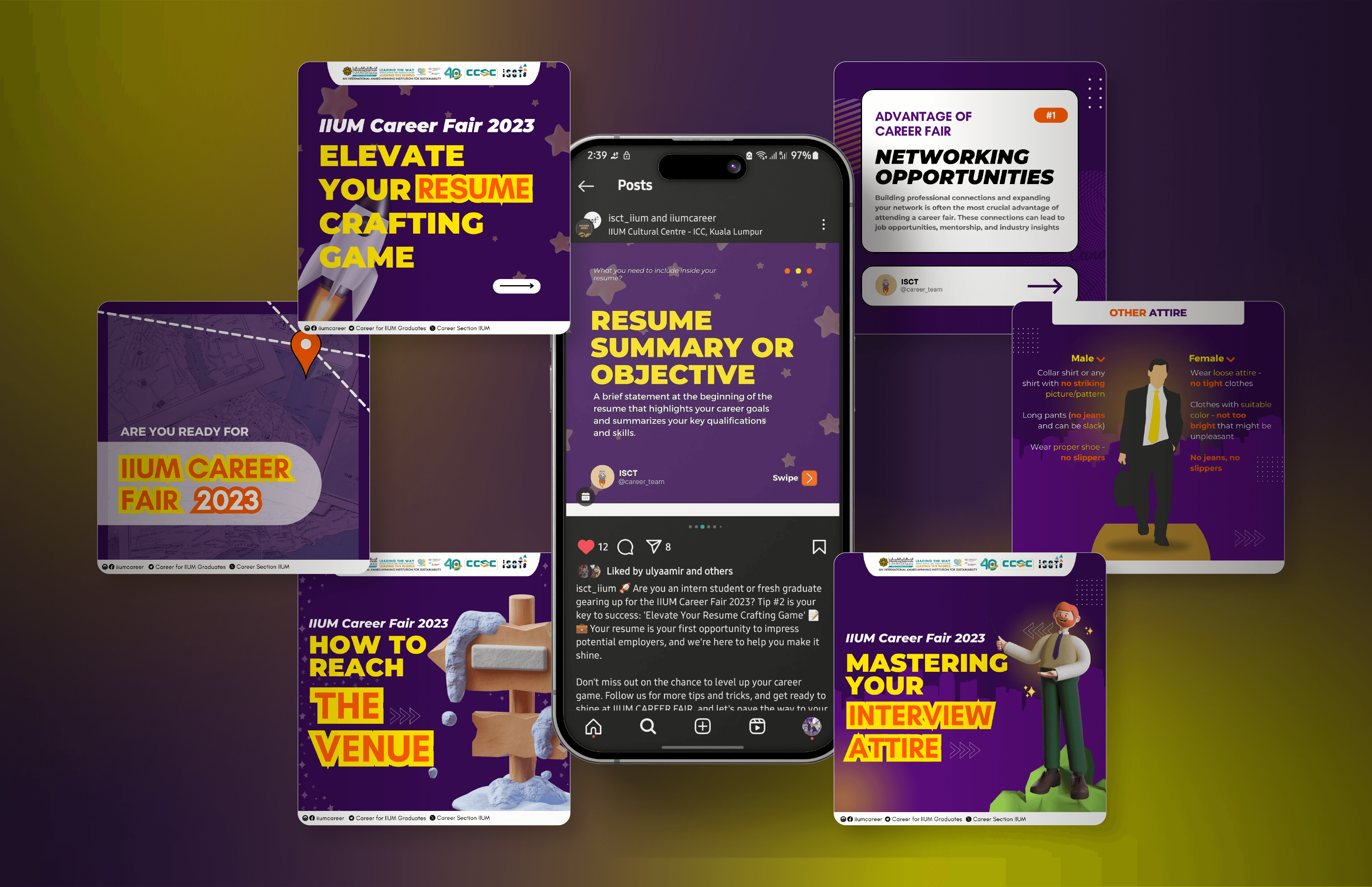 For the IIUM Career Team, I designed event posters to promote career fairs and provide valuable tips, covering dress codes, resume-building advice, and so on. I ensured consistency across all designs by using bold typography for the title and highlighting key topic words to enhance readability and focus.