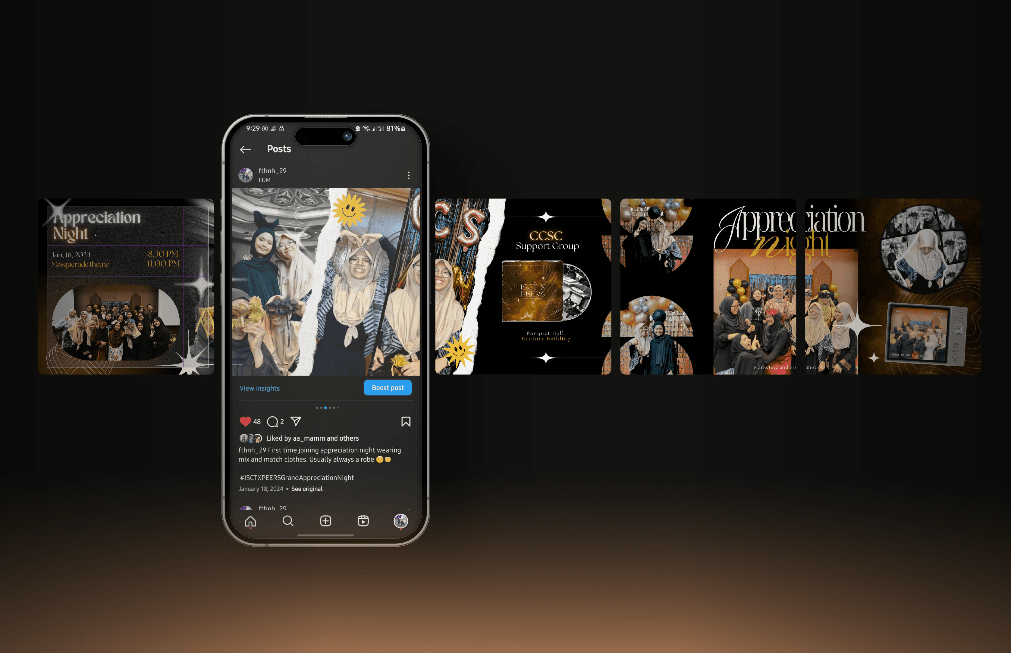 By using a black minimalist background with gold, white, and mustard accents, the Appreciation Night carousel poster exudes elegance, fitting for a dinner event with university clubs and staff. Sparkles and subtle glows further enhance its sophisticated appeal.