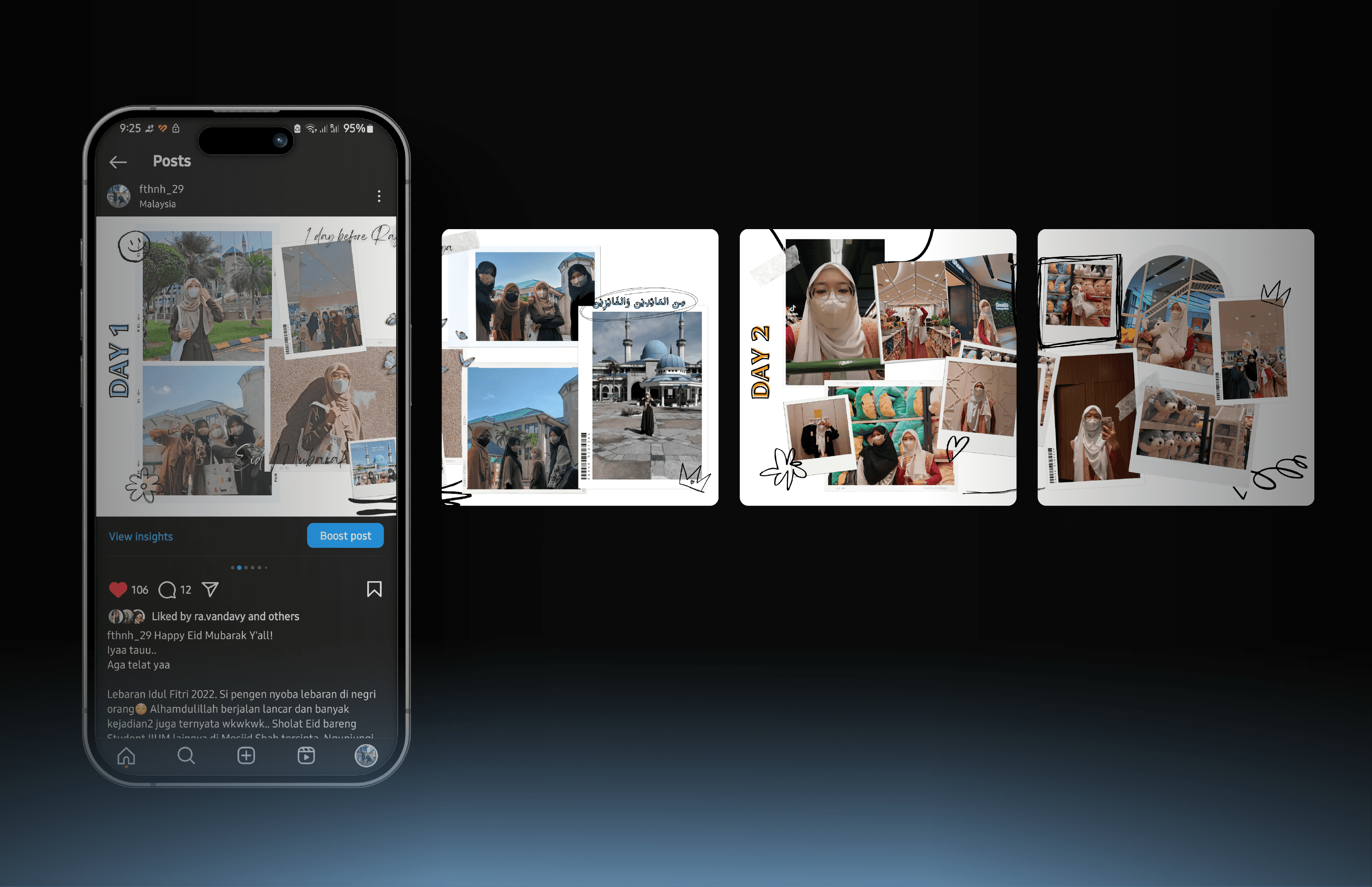 The Eid Fitri Celebration carousel poster is split into two—Day 1 and Day 2. It includes a playable video available on my Instagram. The design embraces a simple, hand-drawn style, giving it a warm and childlike charm.
