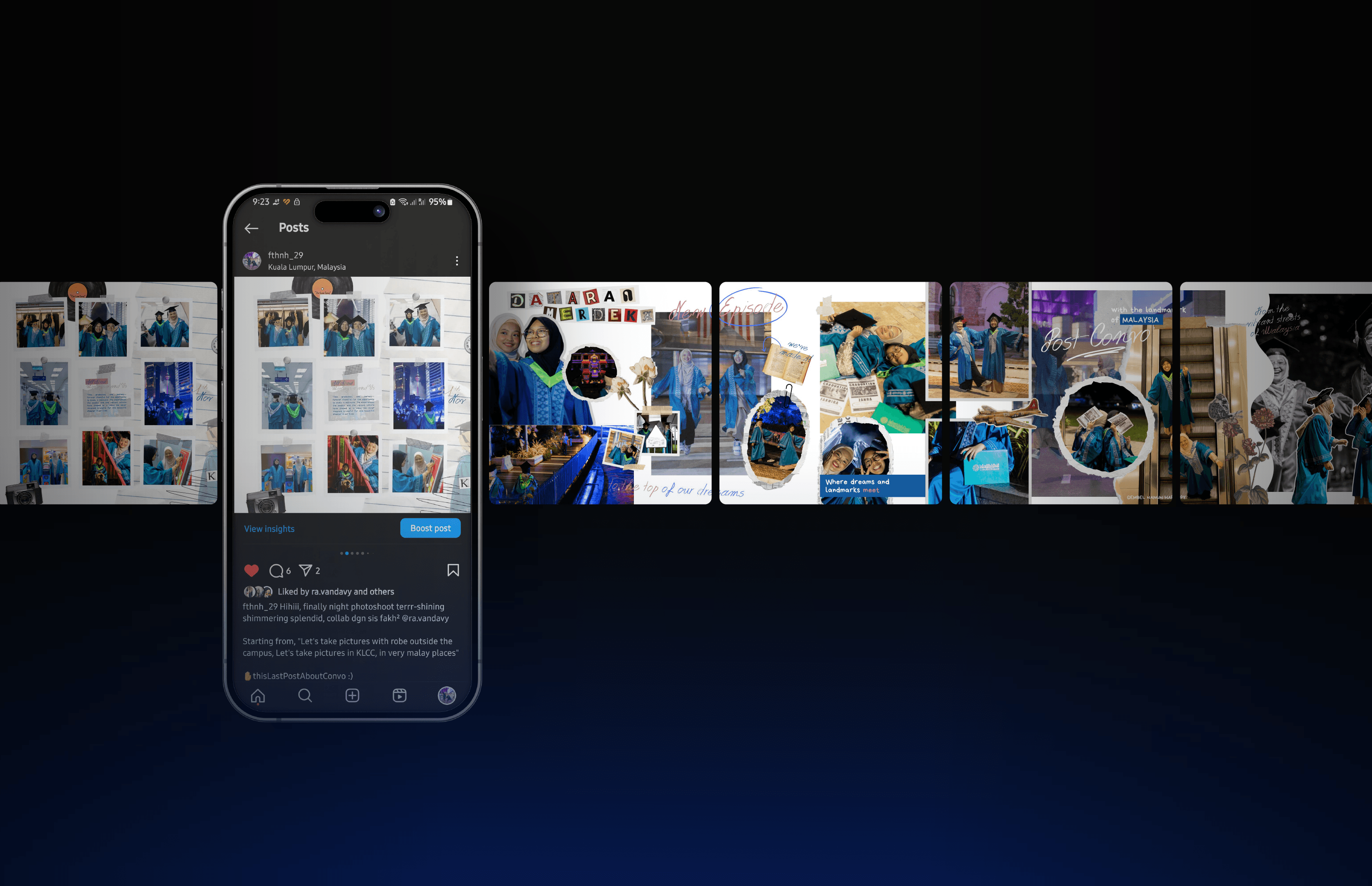 A design that embraces a formal and harmonious theme, preserving the beauty of this memorable day. A bright white background sets the tone, complemented by nostalgic elements like cassettes, cameras, flowers, and vintage airplane toys. The concept captures two Indonesian students in Malaysia, reminiscing about its nighttime charm, with each photo labeled by location.