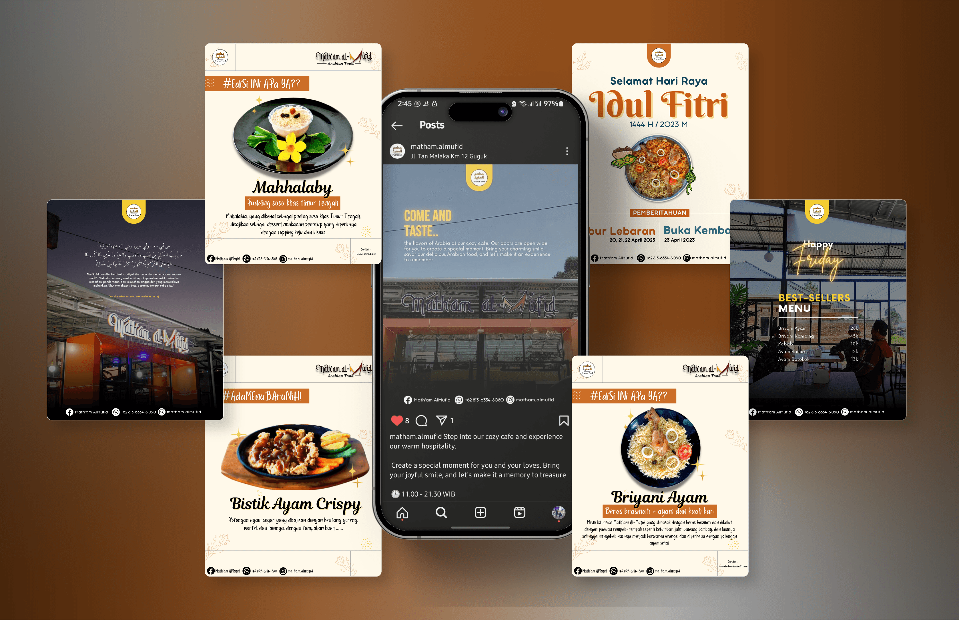 I designed posters for its grand opening, showcasing the main menu and incorporating motivational Islamic quotes to align with the restaurant's Arabic theme. I chose orange and yellow to evoke feelings of hunger and highlight the connection to food.