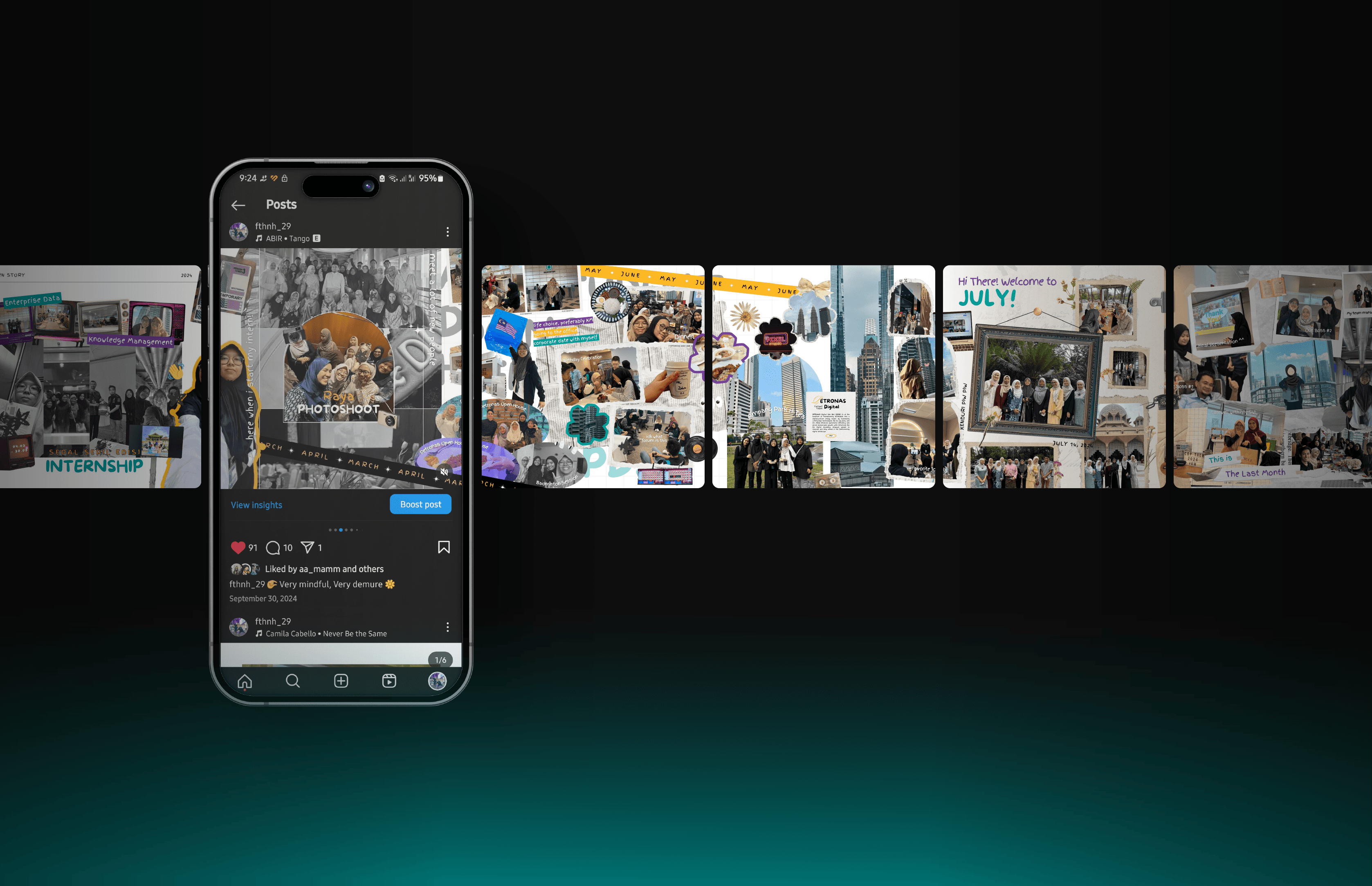 The Intern Snapshots carousel poster adopts a fun and vibrant theme, blending yellow, purple, and green tosca to reflect creativity and enthusiasm. The layout features a dynamic mix of images and graphics, creating a lively and engaging look. The content is split into two parts, showcasing key moments from each half of the internship.